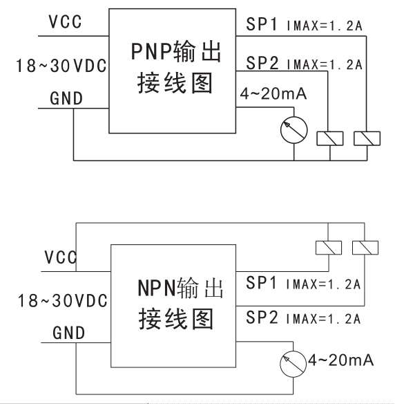 兩路開關量輸出(NPN/PNP),帶載能力1.2A